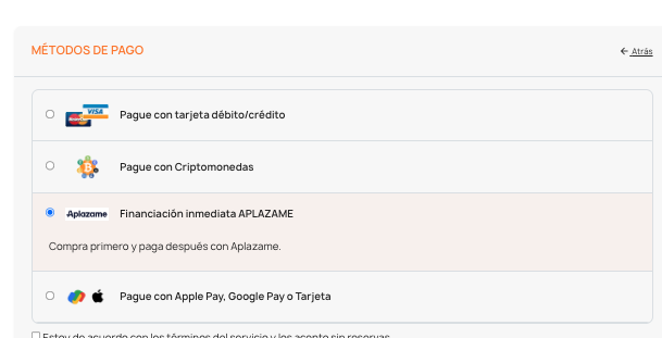 Pasos para seleccionar Aplazame como método de pago