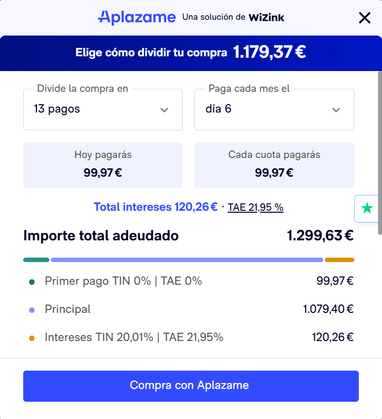 *Ejemplo de financiación con APLAZAME para una compra de 1.000,00€ a 12 meses y que comienza a pagar a los 30 días de la solicitud. Se solicita una entrada de 84,84€ que el usuario debe pagar a través de su tarjeta en el momento en que realiza la operación. El importe a financiar es la diferencia entre el valor de la cesta (1.000,00€) y la entrada (84,84€): 915,16€. Se solicitan 12 mensualidades de 84,78€. Comisión de apertura: 0€. TIN 20,01%; TAE 21,95%. Importe total adeudado: 1.017,36€. PVP 1.000,00€. Precio total a plazos 1.102,20€. Sujeto a la aprobación por parte de APLAZAME (WiZink Bank, S.A.U.).